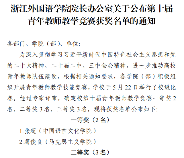 近日,浙江外国语学院院长办公室公布了校第十届青年教师教学竞赛获奖名单,经专家评审,共评选出一等奖2名、二等奖3名、三等奖3名。其中,我院葛俊良教师凭借优异表现,荣膺一等奖。