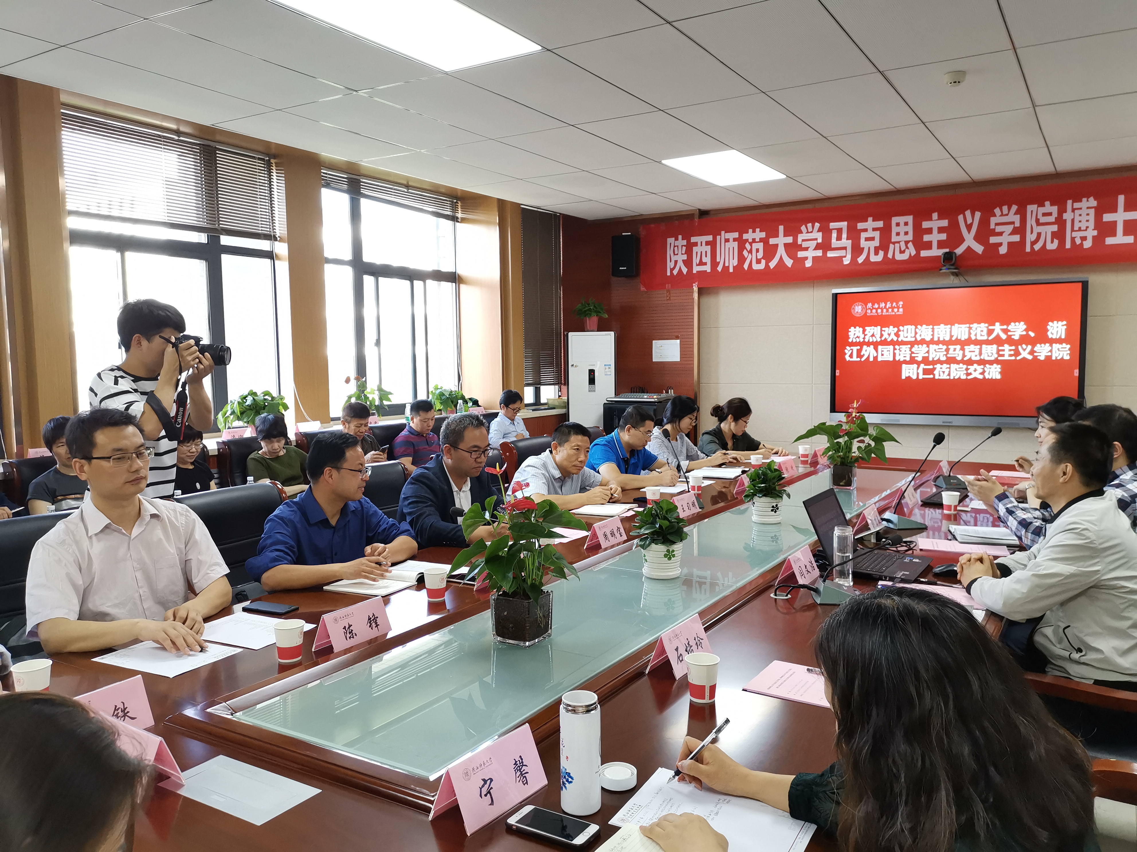 随后,学院一行前往陕西师范大学马克思主义学院进行调研交流学习。陕西师范大学马克思主义学院党委书记闫文浩、副院长刘力波、副书记屈桃陪同参观了学院党建思政、教学学科成果走廊、资料室、录播教室、教授工作室、党团活动室等教学、办公场所和设施,学院环境充满马克思主义文化特色和现代化气息,给人留下了深刻印象。
