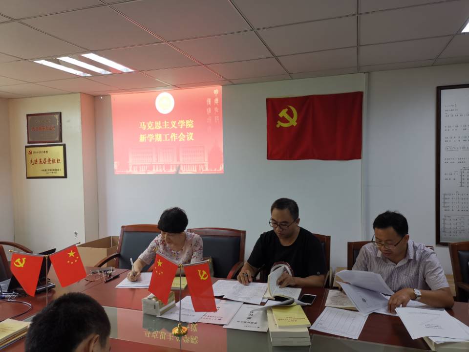 会上,学院党总支负责人周明宝认真传达了校党委宣勇书记在2019年暑期中层干部读书会的讲话精神,详细解读了学校对马院考核的各项指标、完成现状及努力方向,要求大家立足校党代会对马院发展要求和马克思主义学院发展规划制定的目标,牢记使命,担当作为,提升本领,同时他还围绕学院班子和学校签订的党风廉政建设责任书、意识形态工作责任书内容,进一步强调了马院作为一个意识形态教育部门要在讲台讲堂教书育人空间、网络与实践育人空间等各方面当好优秀“战士”、在党风廉政建设方面做成标杆的重要性。会上同时对本学期理论学习与调研工作、持续深化“青年学子学青年习近平”学习教育,清廉教育进课堂、搬迁与新场地阵地美化工作、网站建设工作、中秋节慰问离退休人员等工作进行了部署。会议要求,全体马院人要坚持铸魂育人,筑牢马克思主义底色,要进一步提振精神,切实增强使命感、责任感和紧迫感,不忘初心、牢记使命,敢于斗争、甘于奉献,扎实做好新学期各项工作,以优异成绩献礼新中国成立70周年。