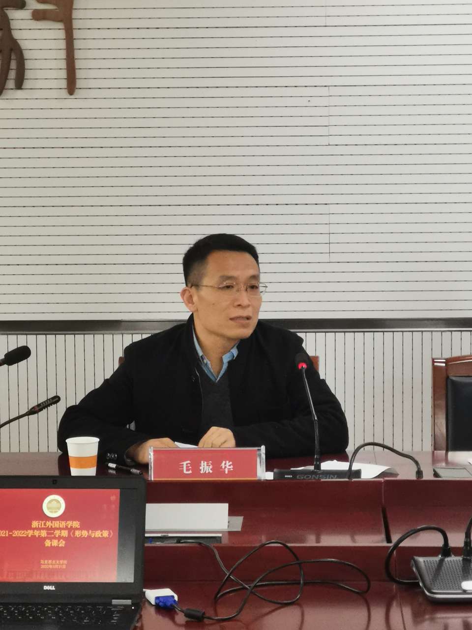 毛振华院长首先对承担形势与政策主讲任务的讲师团成员表示感谢。他指出,校党委历来高度重视形势政策课的建设,今年将迎来党的二十大,本学期的“形势与政策”课教学,将重点围绕这一主题,引导学生学深悟透党的创新理论,弘扬伟大建党精神,坚定走好中国道路、实现中华民族伟大复兴的信心和决心,奋进新征程、建功新时代,喜迎党的二十大胜利召开。同时,他就如何上好形势与政策课,提升教学效果提出四点要求:一要严把意识形态关,要注重知识传授与价值观引导的有机结合;二要做到有机融合。融合浙江实际,学校实际,讲清讲透国家政策,引导学生全面、准确地理解各项方针和政策,树立正确价值观;三要创新教学方式方法。充分利用视频、文件、专家观点等教学资源,调动学生学习的积极性和主动性,加强课堂的互动;四要有品牌意识,打造形势政策“金课”。努力组建一支政策理论宣讲的铁军,充分挖掘教师专业特长,打造形势与政策课不同专题的“专家型”讲师。