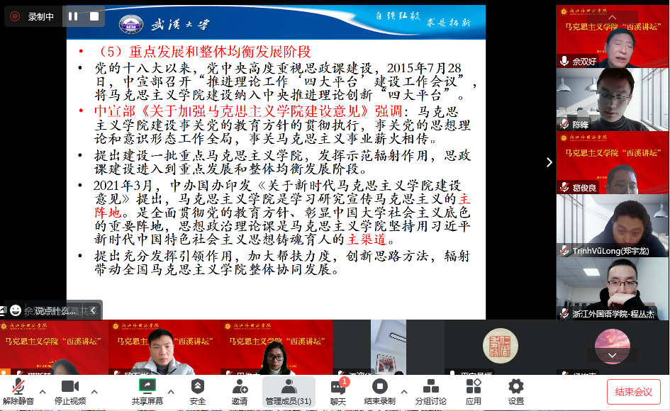 佘双好教授从思想政治理论课老师的专业化发展历程入手,梳理了从教学为主到教学、科研、学科建设全面发展的六个阶段,全面呈现了思政课教师发展面临的新形势。佘双好教授指出,专业发展的要求对专业能力的要求是不断累加的,这就给每一个思想政治理论课老师的专业发展提供了层次性的要求。思政教师既要在思想政治理论课的课堂展示教学能力,同时必须在马克思主义理论这个学科的专业范围内有一个明确的科研方向。最后,佘双好教授从提升教学能力、提升思政课本身的研究能力、提升马克思主义学科建设能力等几个方面对如何提升思政课教师能力提出了建议。