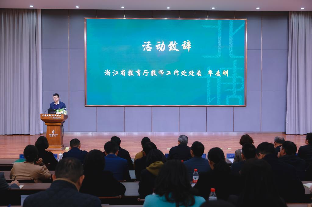 浙江省教育厅教师工作处处长牟凌刚,浙江外国语学院党委副书记赵文波、浙江外国语学院社会服务与合作处处长、省师干训中心常务副主任吴卫东、浙江外国语学院马克思主义学院院长王建新、浙江外国语学院马克思主义学院院长助理欧万彬出席。