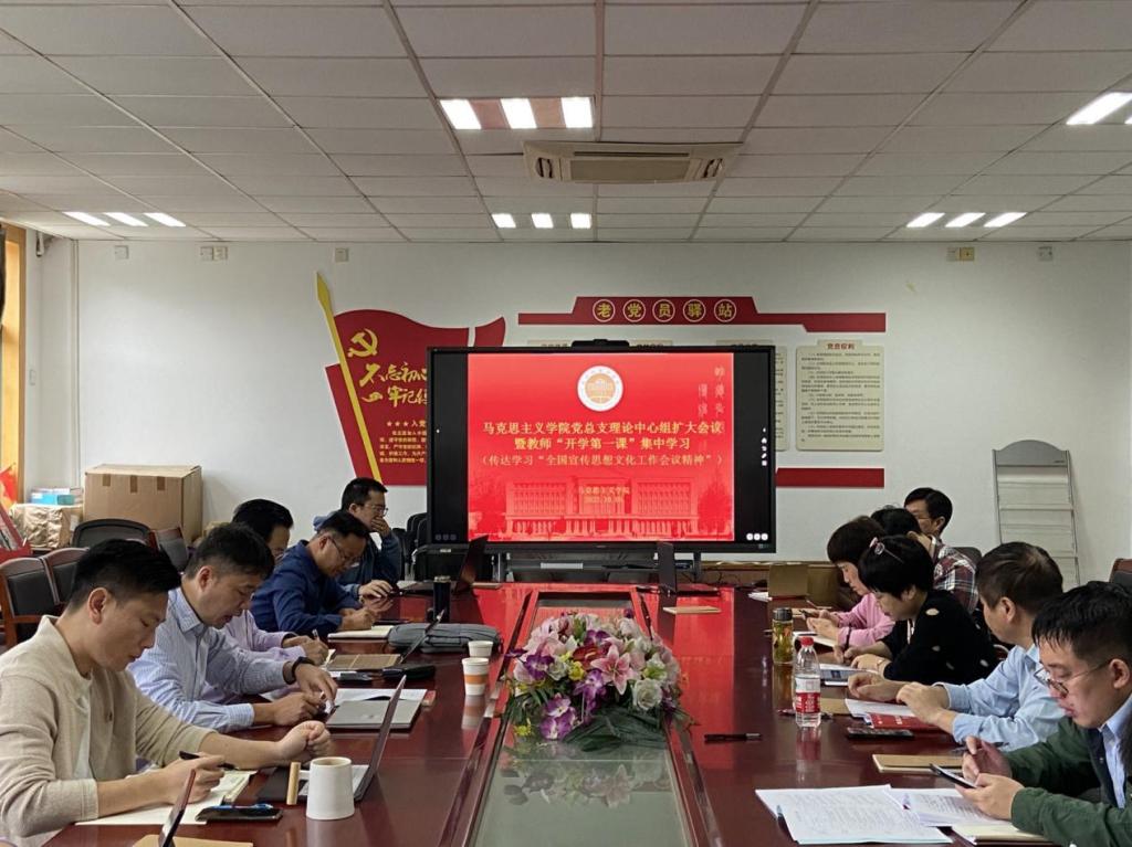 10月9日上午,马克思主义学院召开党总支理论中心组学习扩大会议,专题学习习近平对宣传思想文化工作作出重要指示,传达全国宣传思想文化工作会议精神。马克思主义学院党政领导班子,全体教师参加会议,党总支书记毛立峰主持并讲话。