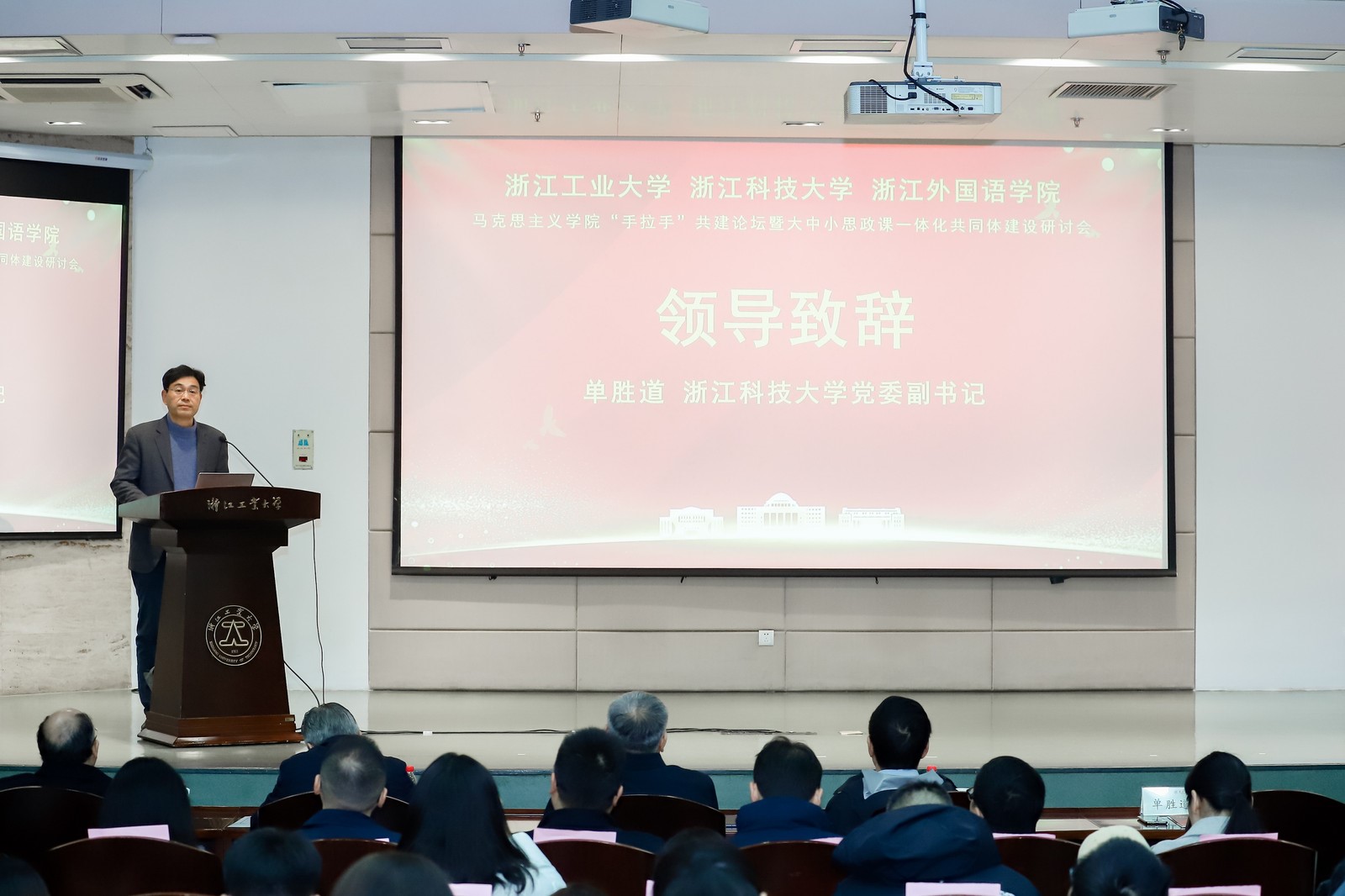 单胜道代表浙江科技大学致辞。他表示,共建联盟对浙江科学大学马克思主义学院的建设和发展起到积极的推动作用,浙江科技大学马克思主义学院将围绕五大发展理念,聚焦四个研究领域,对标省重点马院建设标准,提升马克思主义理论学科整体水平。