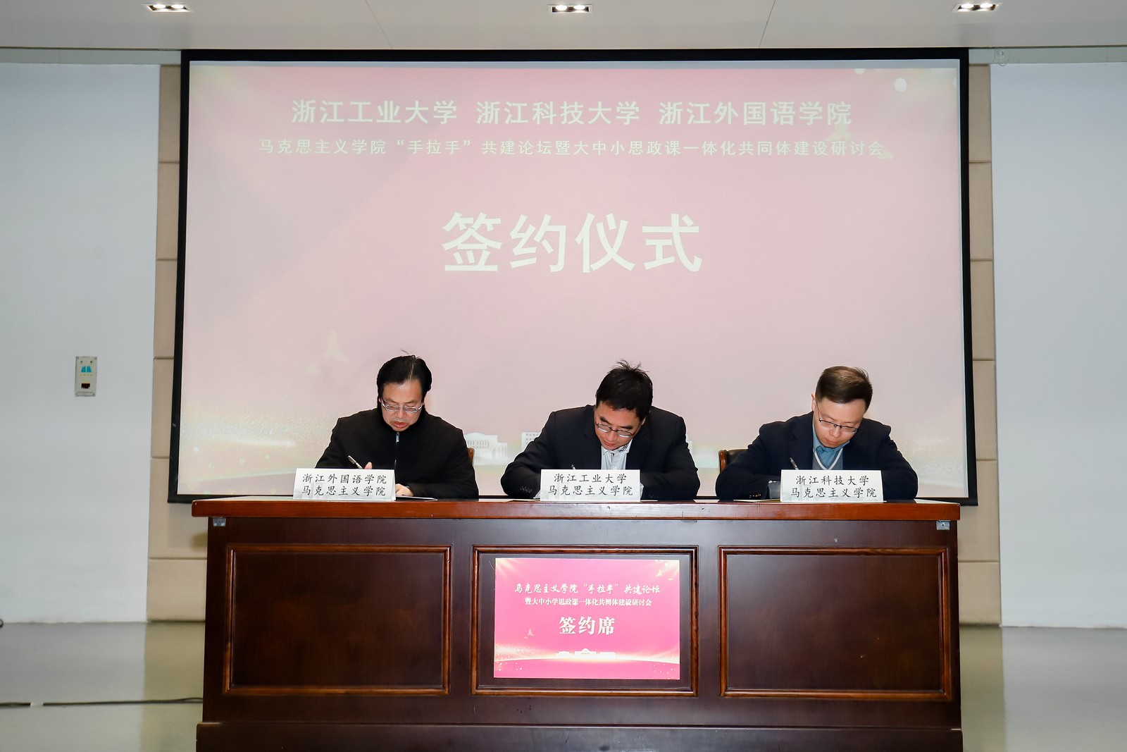 开幕式上,陈杰、单胜道、赵文波共同为“手拉手”共建马克思主义学院揭牌。三家马院负责人为马克思主义学院“手拉手”共建联盟签约,并为思想政治理论课实践导师颁发聘书。