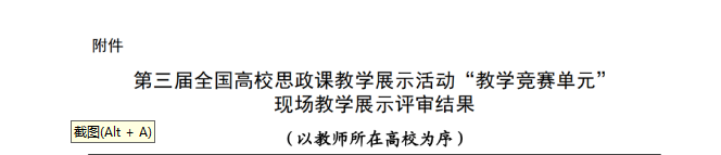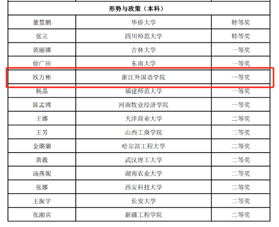 据悉,此次全国高校思想政治理论课教学展示活动,包括思政课一体化展示单元、思政课教学竞赛单元和思政课教学资源共享单元。旨在通过活动,推广一批优质教学资源和先进教学法,表彰一批热爱教学、钻研教学的优秀思政课教师。此次教学展示形势与政策(本科)组共15人获奖,其中特等奖2人,一等奖5人,二等奖8人。