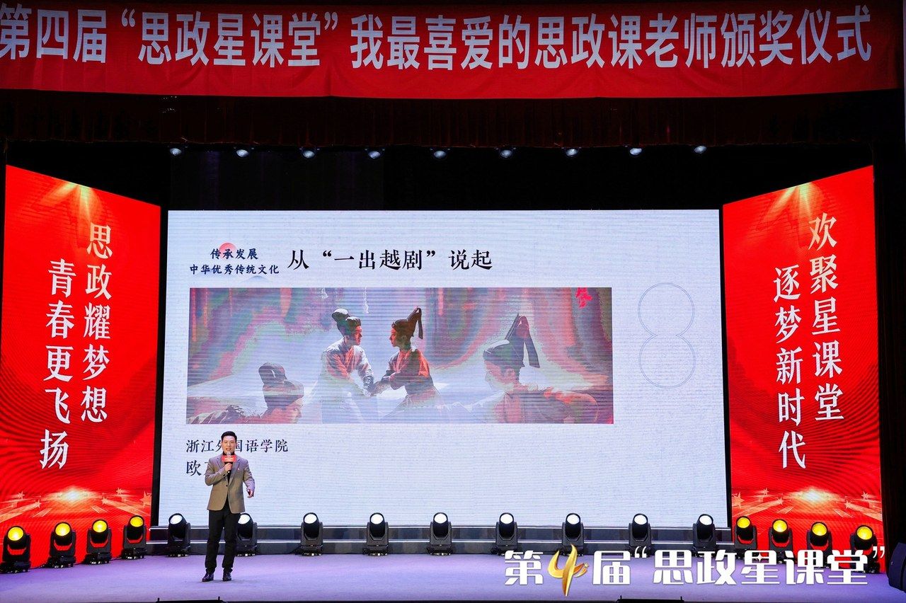 颁奖仪式上,欧万彬老师作为全省高校思政课教师代表与来自中学、小学的思政课教师代表共同围绕《传承发展中华优秀传统文化》的主题作现场讲课展示。三位老师以“一题三讲”的形式,分别通过“一出越剧”“一部家训”“一本动漫”为大中小思政课一体化建设呈现了一堂别开生面的思政课。