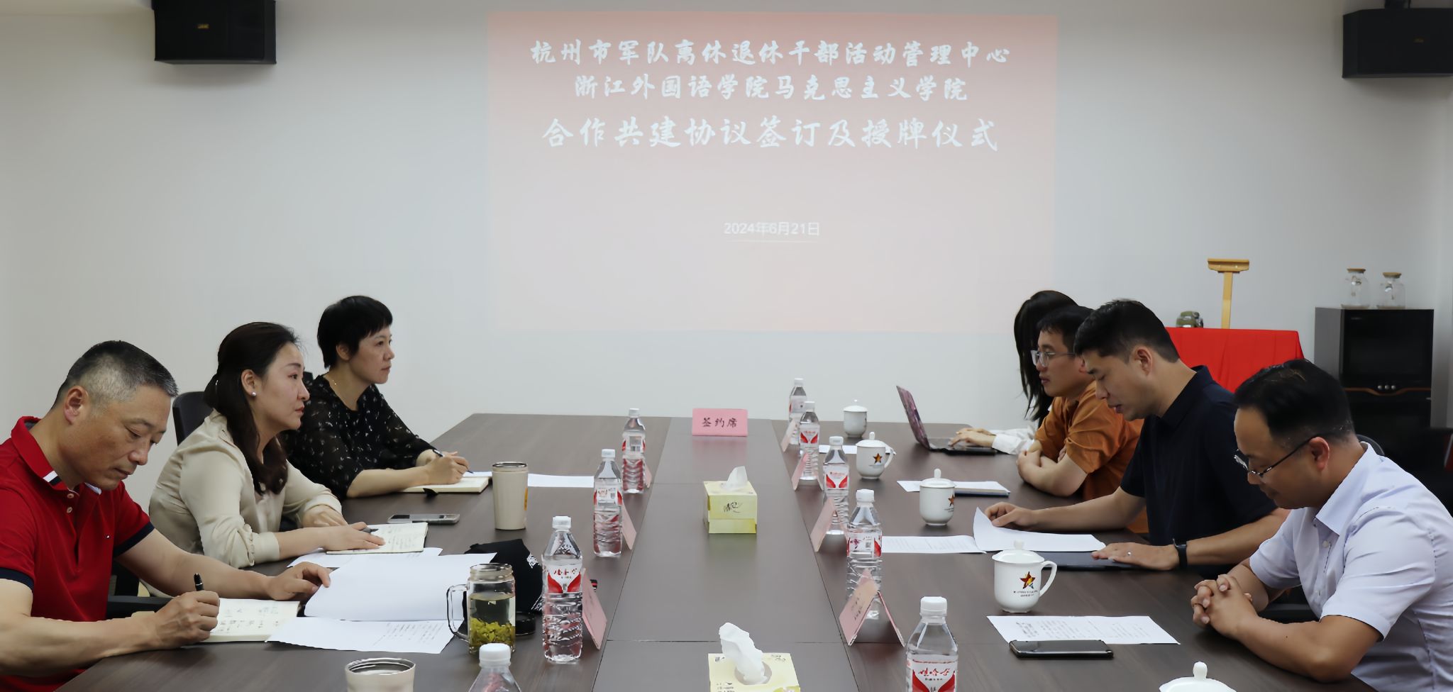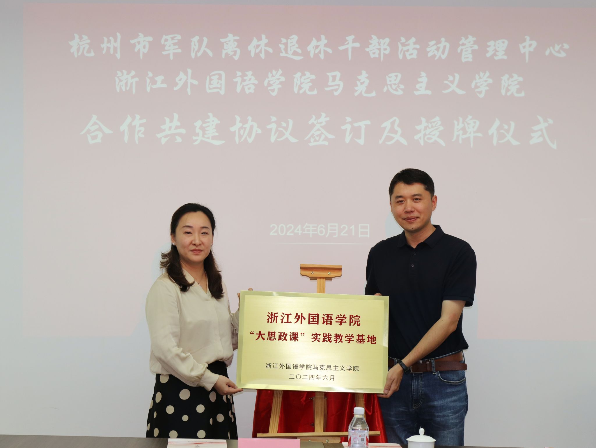 杭州市军队离休退休干部活动管理中心书记、主任韩冰在致辞中,表达了对双方合作共建美好前景的期盼和信心。希望以合作共建签约授牌仪式为起点,深化“红色军休”文化地标、思政基地建设等方面合作,通过强强合作、优势互补,不断扩宽合作形式,形成丰富合作成果,为杭州军休文化高质量发展和浙外马院高质量建设提供有力支撑。