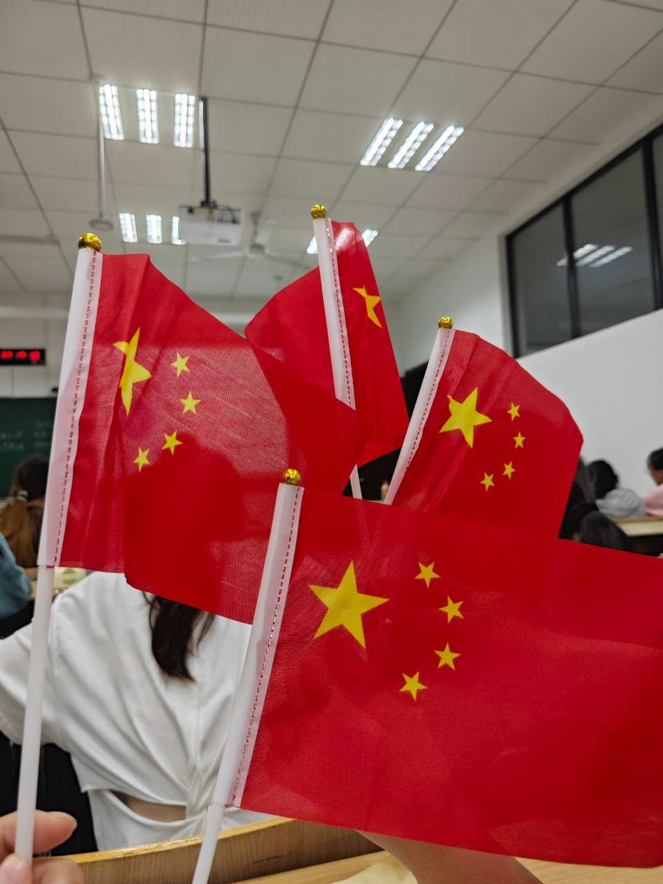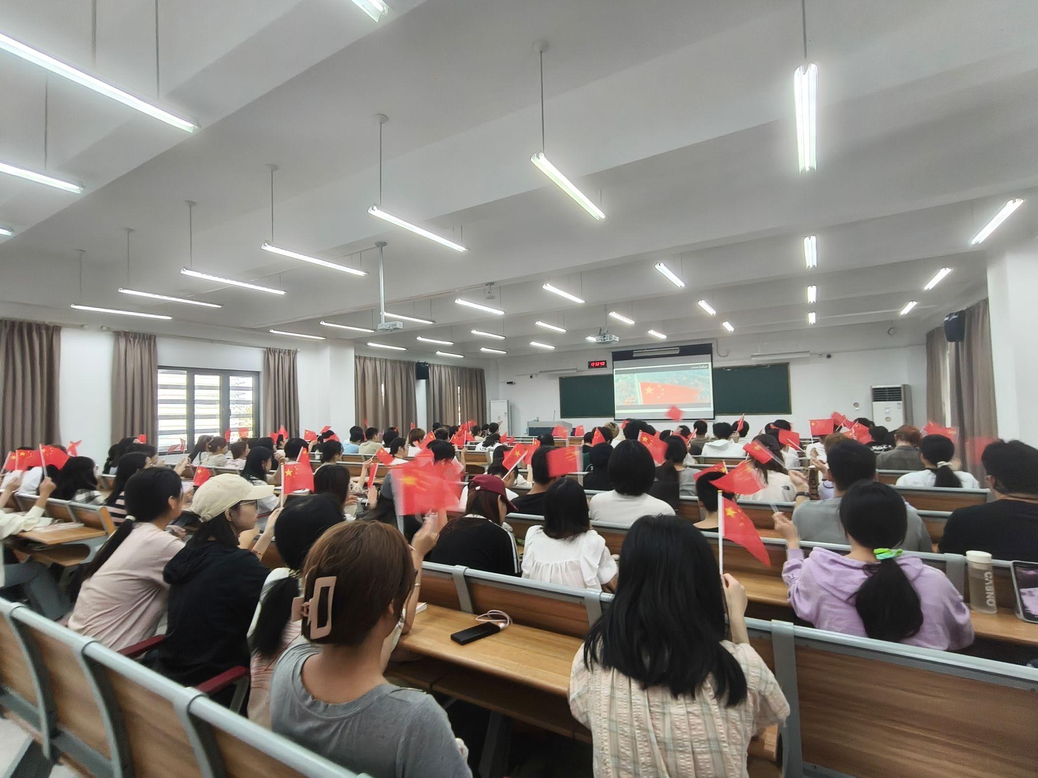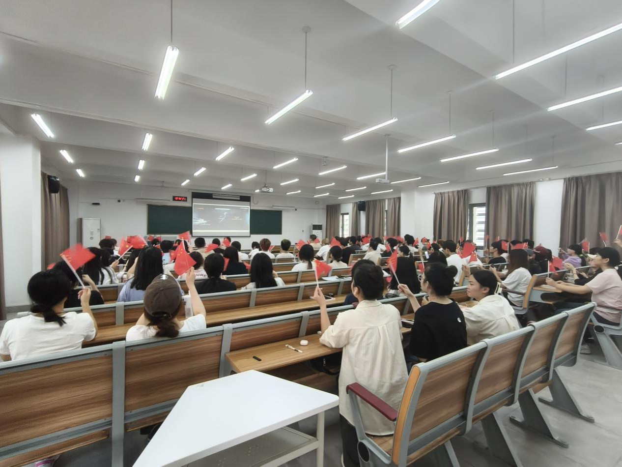 课堂上,师生挥舞着五星红旗,一起合唱了《歌唱祖国》《我和我的祖国》等经典歌曲,观看了我们伟大祖国建国的艰辛卓绝奋斗历程以及祖国从站起来到富起来到强起来的伟大飞跃视频。