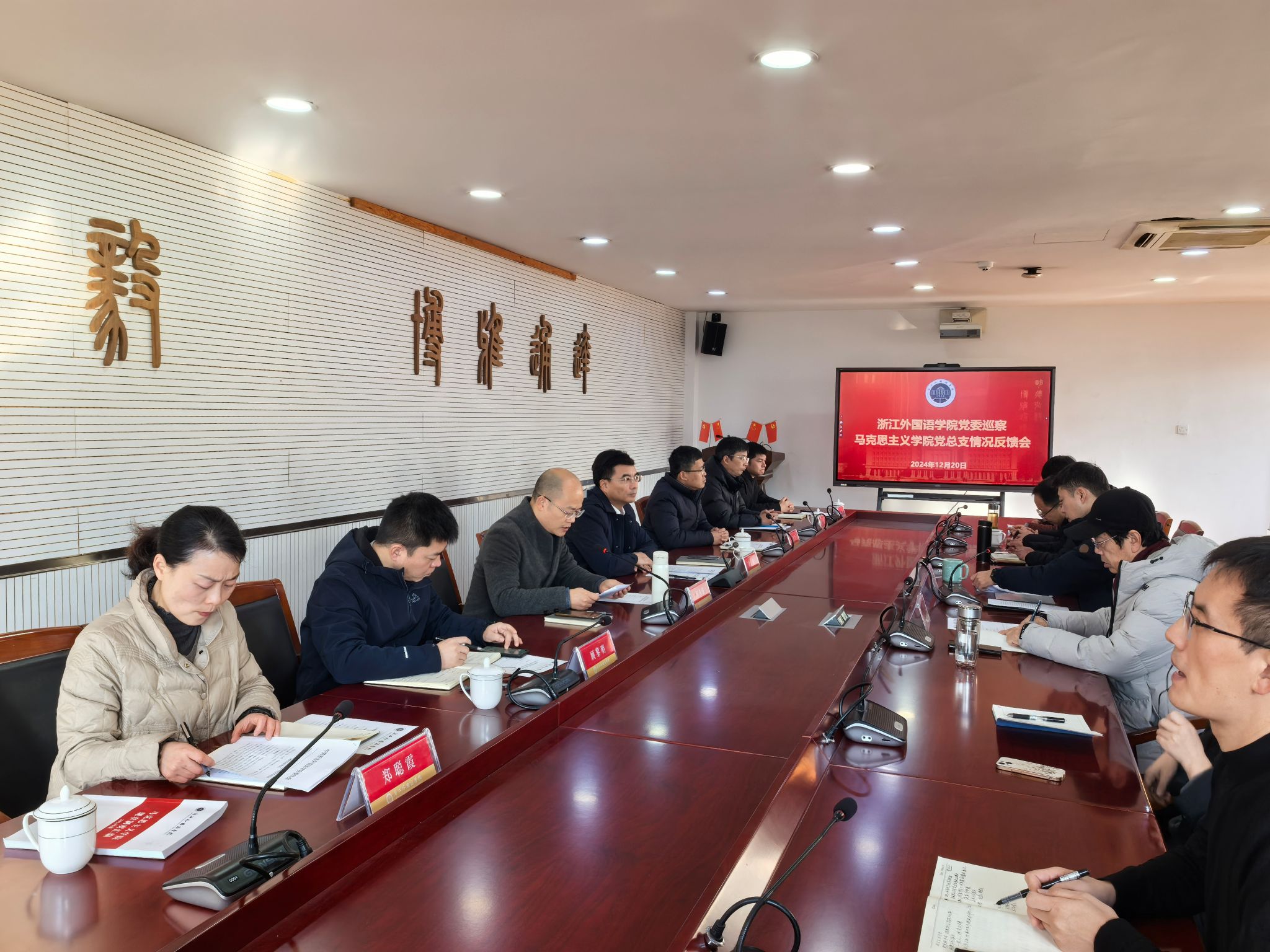 巡察组组长何伟强宣读了学校党委巡察反馈意见,对马克思主义学院始终坚持“马院姓马,在马言马”的鲜明导向,明确聚焦学校“外语名校”建设目标,以“党建+1333”工作体系为抓手,整体推进党建业务双融合双促进所取得的成绩表示肯定,同时也指出了学院在新时代马克思主义学院建设、政治引领力、学院内部治理、上一轮巡察发现问题整改情况等方面存在的不足,并提出了整改意见建议。