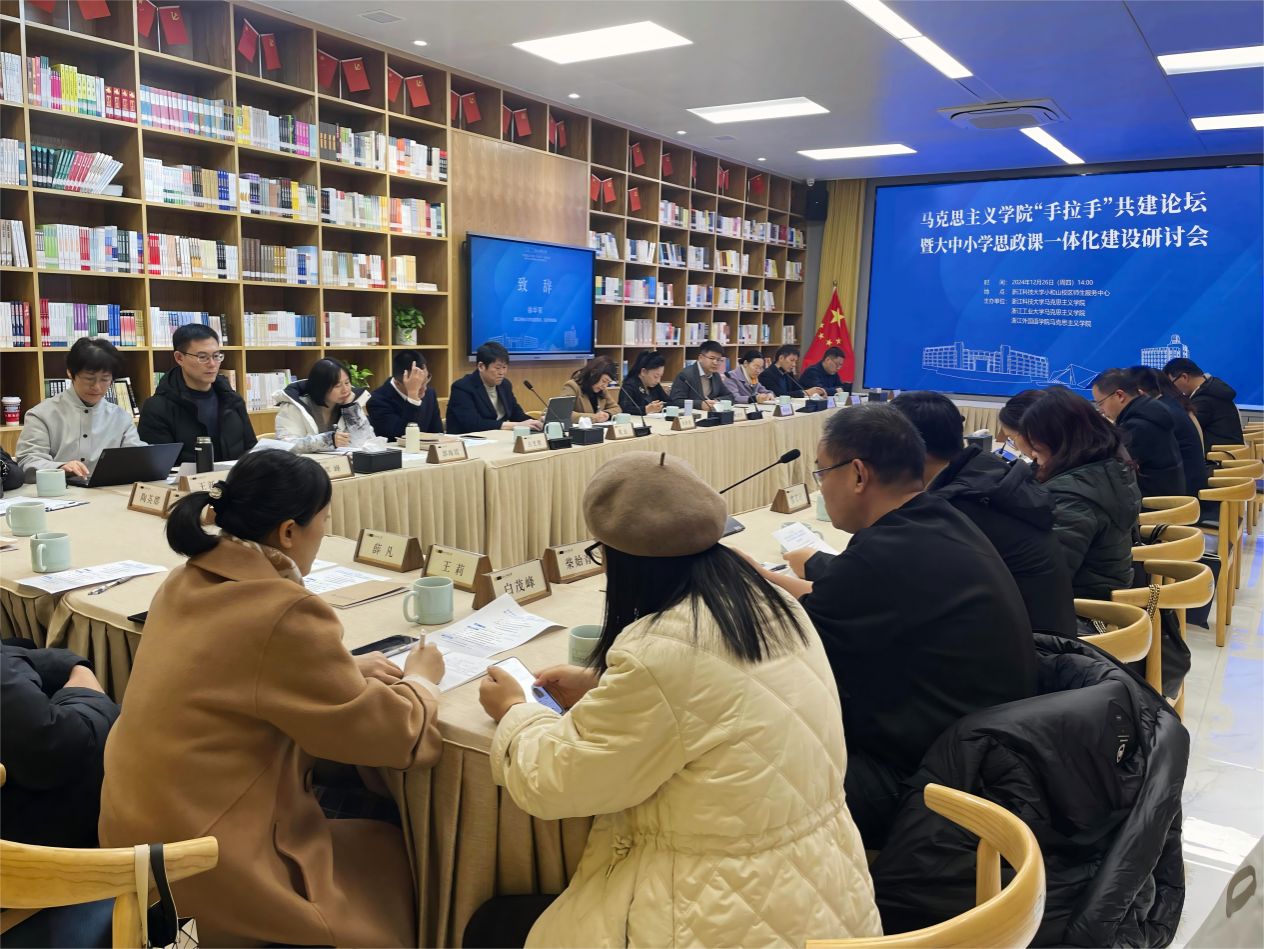 12月26日,在杭高校马克思主义学院“手拉手”共建论坛暨大中小学思政课一体化建设研讨会在浙江科技大学小和山校区师生服务中心召开。