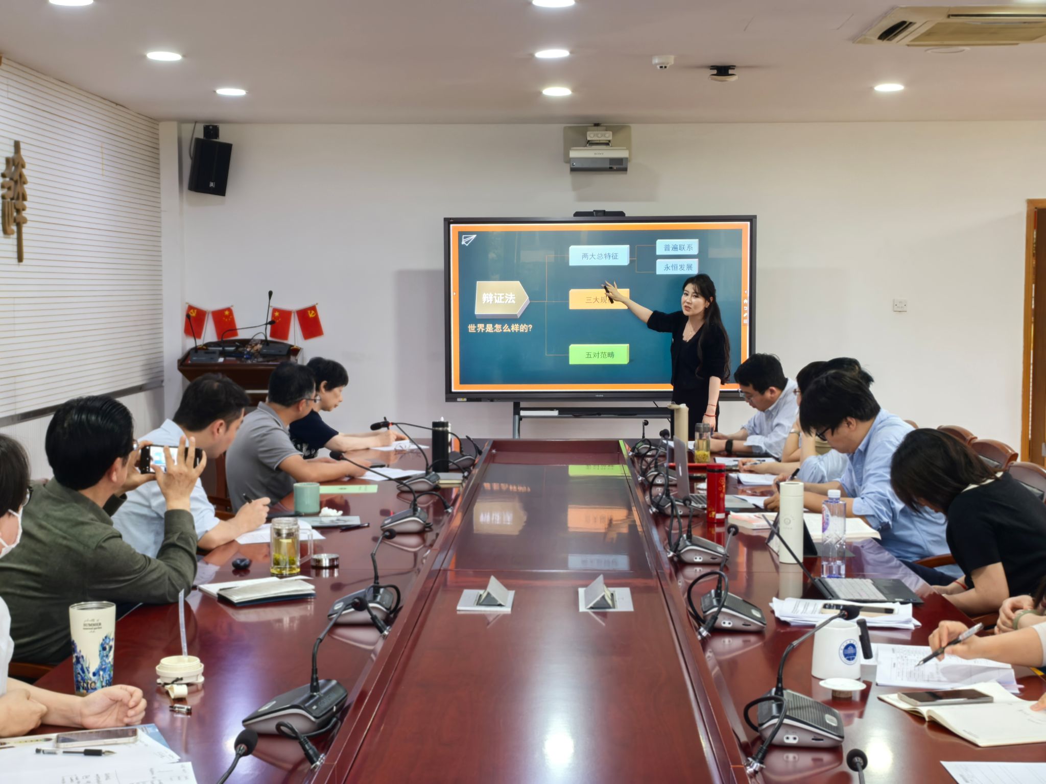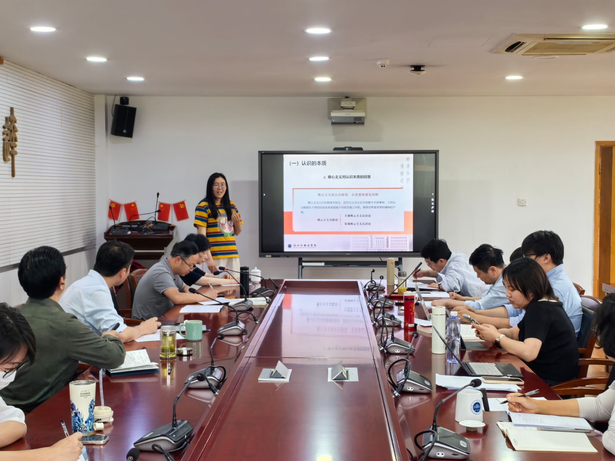 “中国式现代化的特征”,围绕基于国情的特色道路五大特征,深刻分析了中国现代化道路的独特性和优越性。徐伟信主讲“推动高质量发展”,重点研讨了新时代推动实现高质量发展,如何坚持和完善社会主义基本经济制度。应舒悦主讲“马克思主义认识论——认识的本质”,通过对唯心主义认识论和旧唯物主义认识论的批判,引出马克思主义的认识论的优越性。梁馨熠主讲“否定之否定规律”,围绕马克思主义否定观的核心概念、辩证否定观的基本内容及否定之否定基本规律进行深入分析。