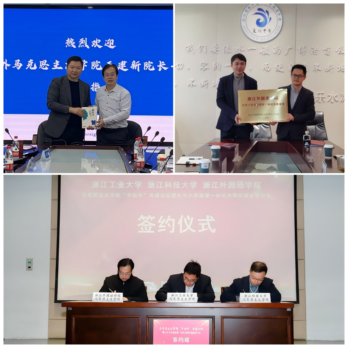 加强内外协同,打造“大思政课”格局。坚持开门办马院,先后与杭州“五四宪法”历史资料陈列馆、富阳区常安镇、杭州市军队离退休干部活动管理中心、萧山区钱江教育指导中心等多家单位签约共建“大思政课”实践基地。联合浙江工业大学、浙江科技大学马克思主义学院开展“手拉手”共建,召开“大中小学思政课一体化”共同体建设研讨会。与杭州外国语学校、夏衍中学建立“大中小学思政教育一体化实践基地”。