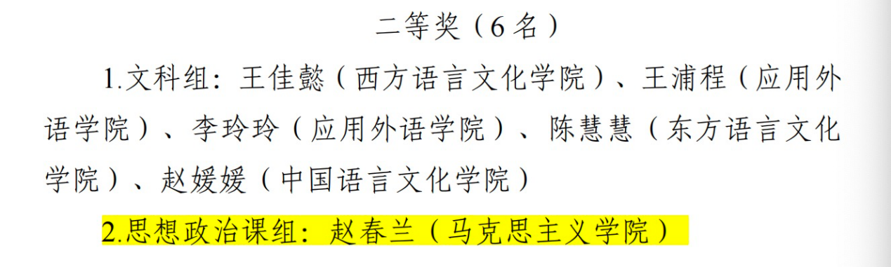 近日,浙江外国语学院院长办公室公布了校第九届青年教师教学竞赛获奖名单,经专家评审,共评选出个人特等奖2名、一等奖4名、二等奖6名、三等奖6名,我院赵春兰教师获思政课组二等奖。