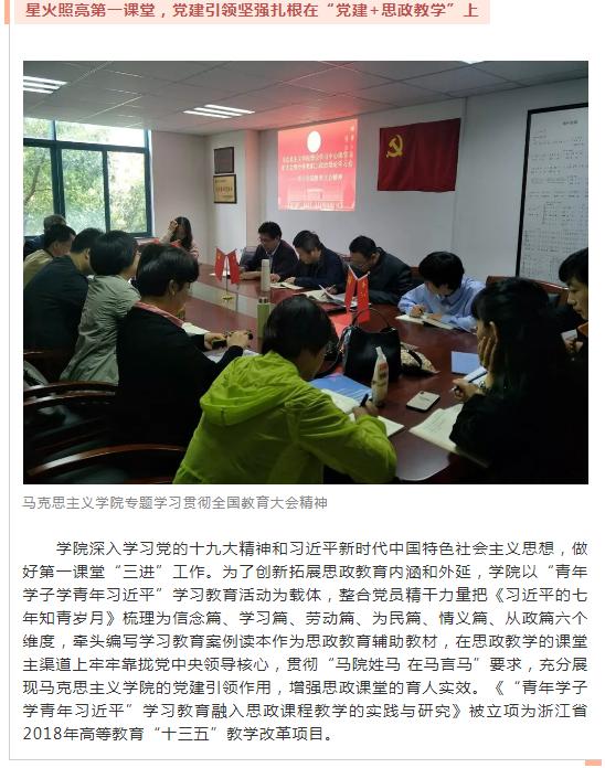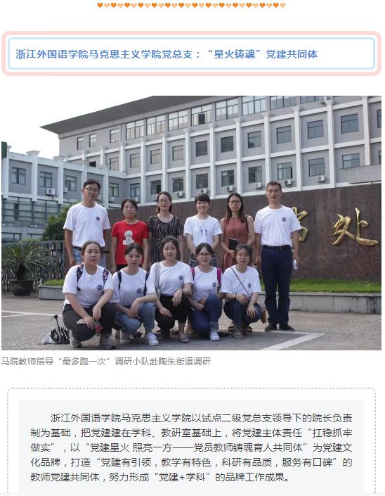 近日,教育之江官方微信平台以“新时代,共担当!‘浙’里高校党建育人打开新局面”为题,报道了浙江外国语学院马克思主义学院党总支“星火铸魂”党建共同体。