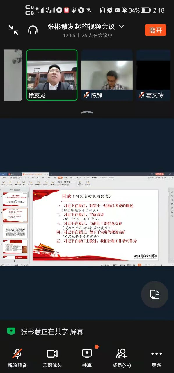 为学好用好《习近平在浙江》,巩固拓展党史学习教育成果,推动学院党史学习教育常态化长效化,3月17日下午,马克思主义学院与浙江水利水电学院马院、校宣传部举行专题理论联学会。省社科院政治学研究所所长、研究员徐友龙受邀出席联学会并作“习近平在浙江”专题报告。