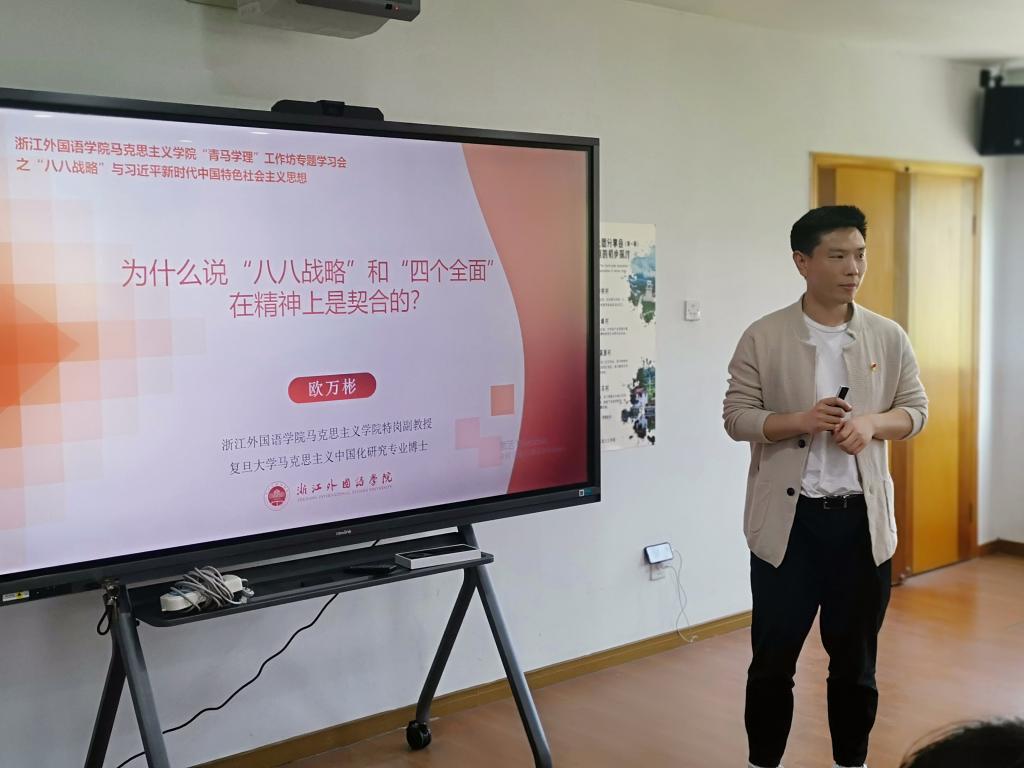 青年教师欧万彬围绕“‘八八战略’和‘四个全面’在精神上是契合的”这一重要论断,作全省主题教育动员大会精神领学。他谈到,“八八战略”和“四个全面”都贯穿着鲜明的问题意识、系统观念、发展导向和人民立场,“八八战略”是中国特色社会主义在省域层面的生动实践,充分体现了习近平总书记治国理政的远见卓识和政治智慧。从“八八战略”中能够深切地感受到习近平总书记深邃的洞察力、科学的判断力、超前的谋划力,特别是善于从时代问题出发,坚持用系统观念在发展中解决问题,从而不断满足人民对美好生活的需要,这也正是“八八战略”和“四个全面”在精神上高度契合的基本逻辑。